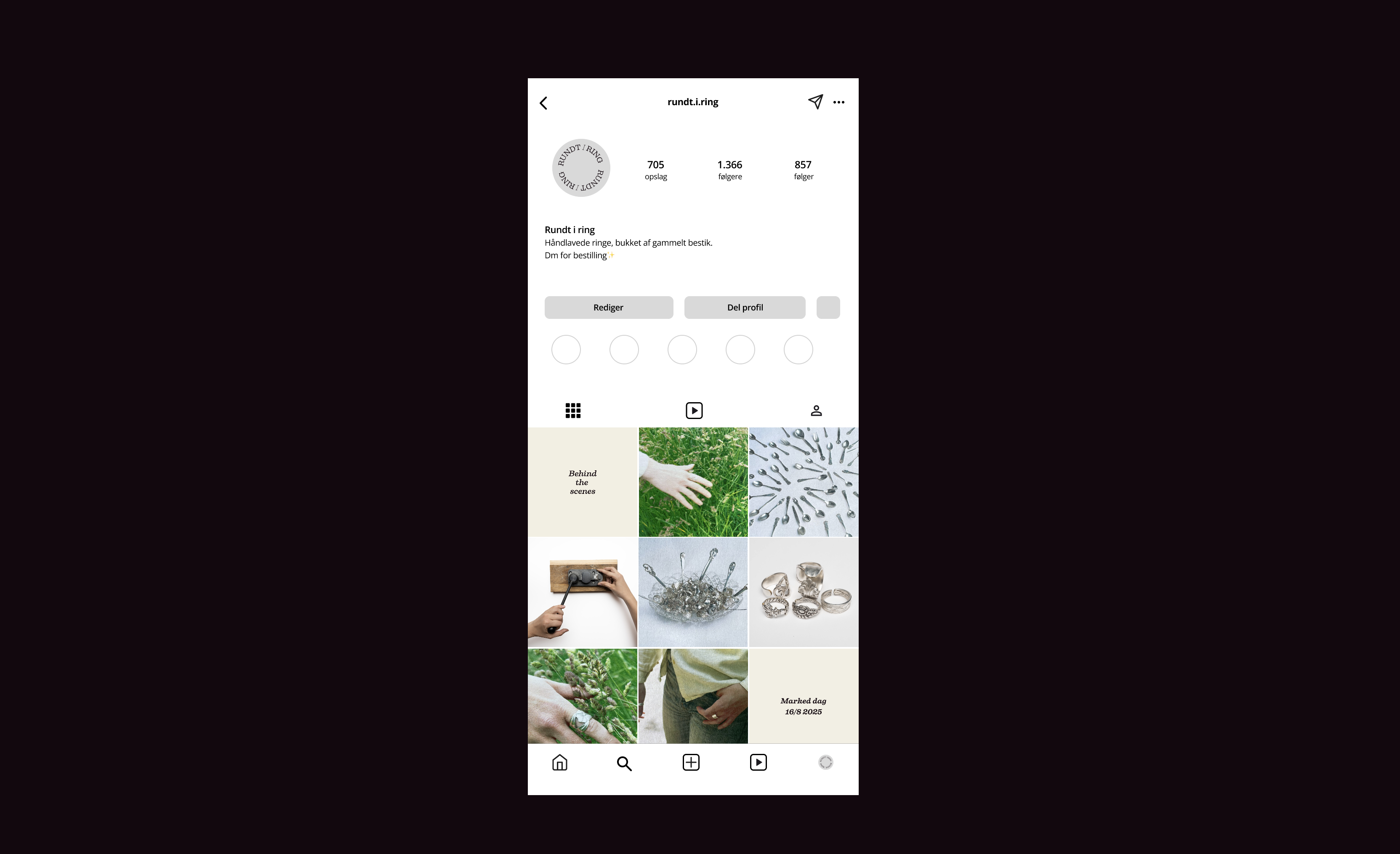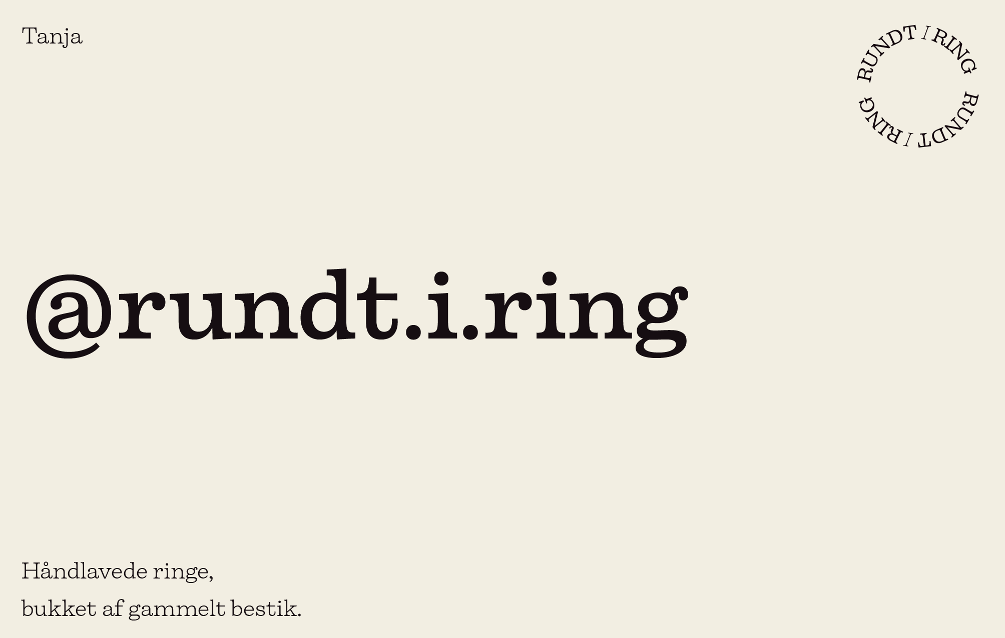 Rundt I Ring is a jewelry brand created by Tanja. She transforms vintage cutlery into beautiful, personal rings through upcycling. The challenge in this project was to communicate, through the visual identity, that each ring has its own unique character and patina. By focusing on texture, nature, and the silverware itself, a coherent visual thread was created to represent the essence of Rundt I Ring.